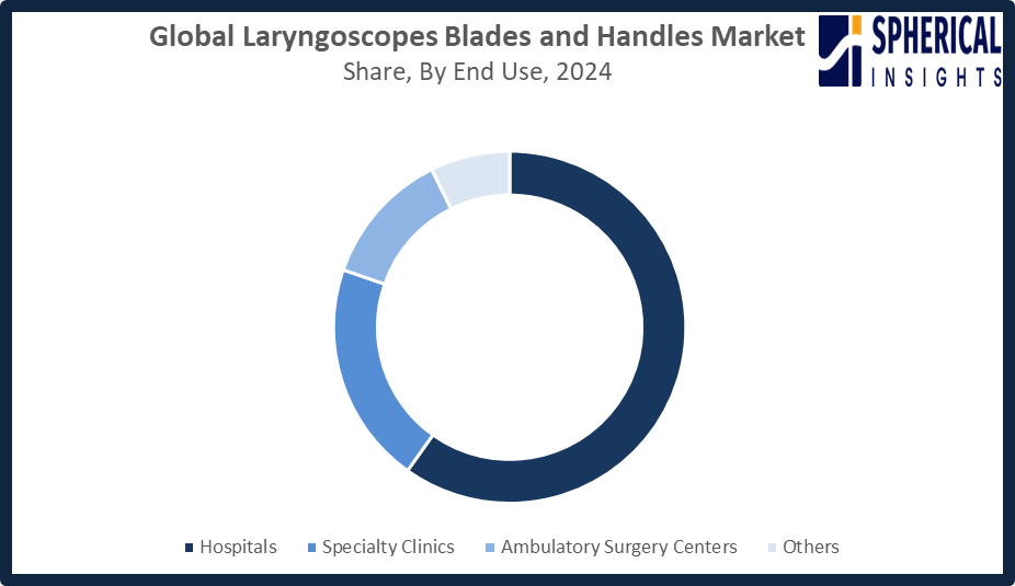 Based on the application, the laryngoscopes blades and handles market is divided into hospitals, specialty clinics, ambulatory surgery centers, and others. Among these, the hospitals segment accounted for the highest market revenue in 2024 and is anticipated to grow at a significant CAGR during the forecast period. Hospitals are very important for the treatment of patients who have complications that require the use of sophisticated airway equipment. They deal with serious cases of respiratory diseases, cancers of the airway, as well as traumas that require emergency intubations or surgery. Laryngoscopes, utilized for normal and emergency care, have important uses in patient protection under anesthesia or airway obstruction.