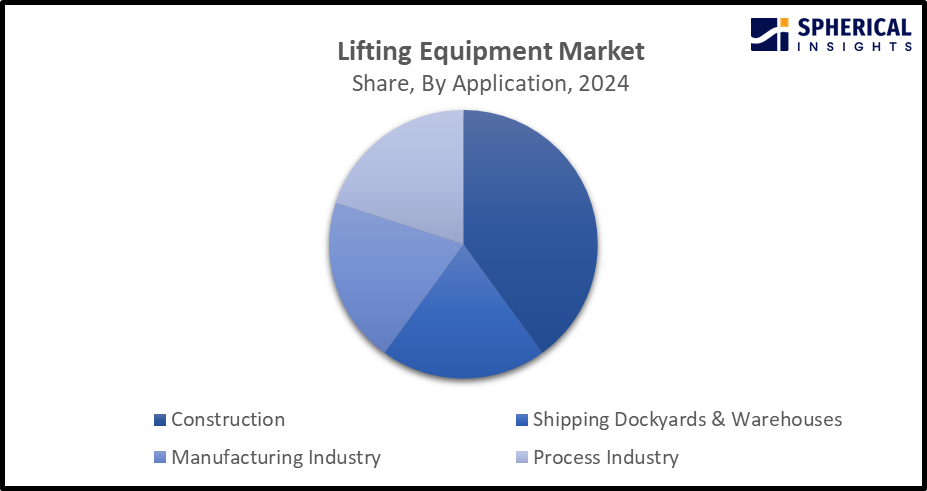 Based on the application, the lifting equipment market is divided into construction, shipping dockyards & warehouses, manufacturing industry, and process industry. Among these, the construction segment accounted for the largest market revenue share of about 38.5% in 2024 and is expected to grow at a remarkable CAGR during the projected period. Lifting equipment is used in high-rise construction for lifting and lowering loads on site and can include cranes, forklifts, trucks, and lifts. Implementing lifting equipment during construction projects aids in easing the load and improving safety, efficiency, and client satisfaction. Adoption of advanced lifting technologies and infrastructure development is driving the segmental market growth.