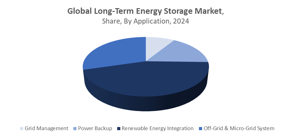 The renewable energy integration segment held the largest market share in the long-term energy storage market. The global push for decarbonization and the quick growth of wind and solar energy projects are the reasons for the renewable energy integration segment. Systems for integrating renewable energy offer the flexibility to store extra energy during high-generation times and release it during low-generation or peak-demand times, guaranteeing grid stability.