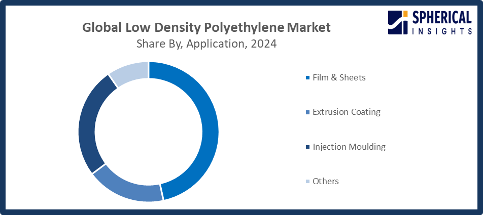 Based on the application, the Low Density Polyethylene Market Size is divided into film & sheets, extrusion coating, injection moulding, and others. Among these, the film & sheets segment accounted for the highest market revenue in 2024 and is anticipated to grow at a significant CAGR during the forecast period. The widespread use of LDPE in flexible packaging, protective films, and industrial sheets which provide lightweight, long-lasting, and affordable solutions has contributed to the expansion of the Film & Sheets segment.