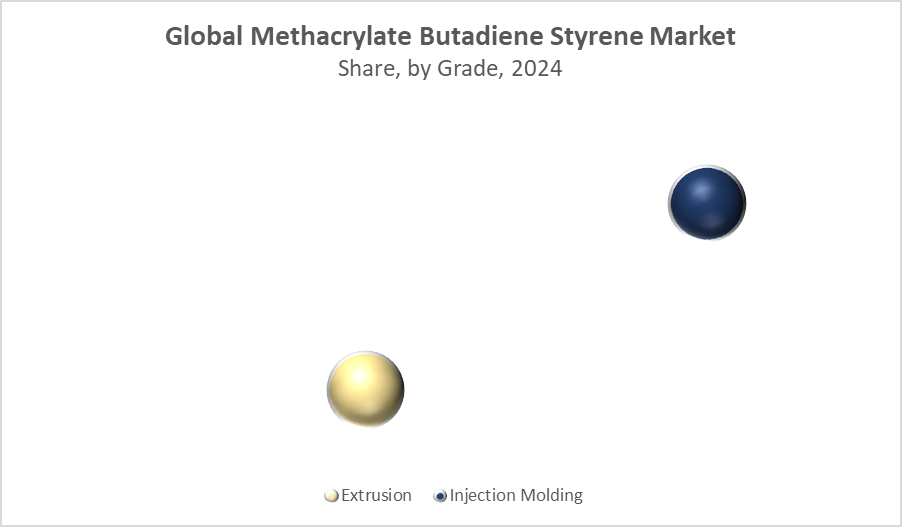 How does the market segment by grade break down in the Methacrylate Butadiene Styrene Market?Injection molding grade holds around 60% of the market share, while extrusion grade accounts for approximately 35%.