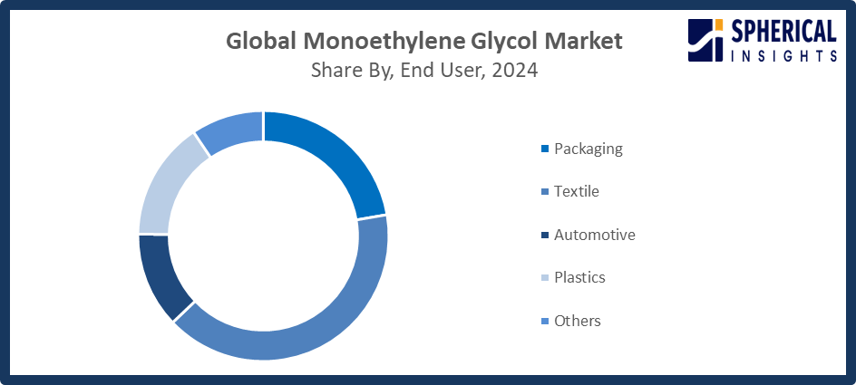 Based on the end user, the monoethylene glycol market is divided into packaging, textile, automotive, plastics, and others. Among these, the textile segment accounted for the highest market revenue in 2024 and is anticipated to grow at a significant CAGR during the forecast period. The demand of synthetic textiles has increased due to rapid urbanization, rising disposable incomes, and shifting consumer lifestyles, which has increased the need for MEG. Monoethylene glycol's wide range of applications in the textile sector, including dyeing, polyester fiber manufacture, textile printing, finishing, and textile processing, is responsible for the market.