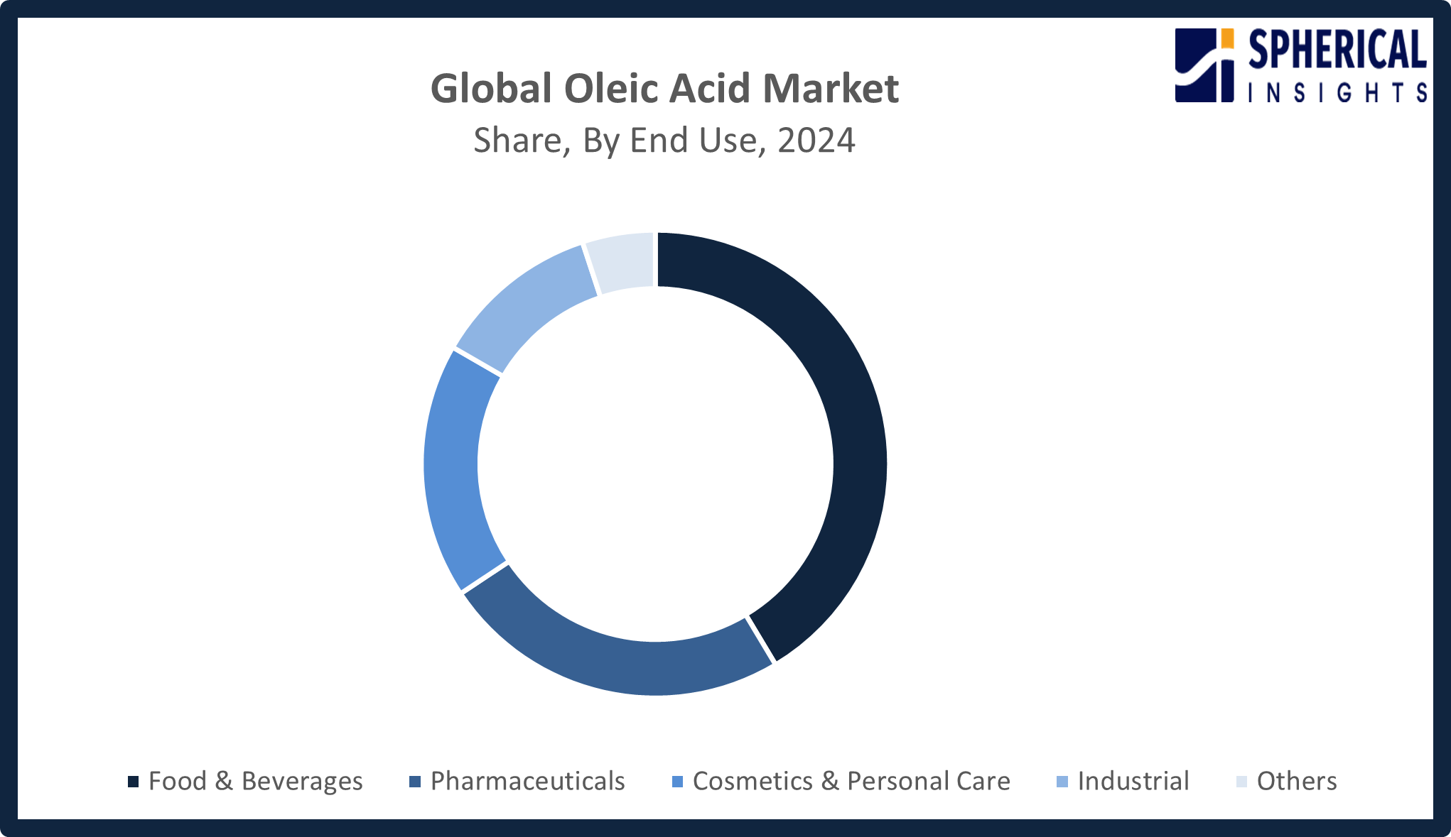 Based on the end use, the Oleic Acid Market Size is divided into food & beverages, pharmaceuticals, cosmetics & personal care, industrial, and others. Among these, the food & beverages segment accounted for the highest market revenue in 2024 and is anticipated to grow at a significant CAGR during the forecast period. The food and beverages segment market growth is due to rising demand for clean-label, plant-based ingredients and healthier fat alternatives. Oleic acid functions as an emulsifier and stabilizer and carrier oil in food processing. The segment growth accelerated because consumers learned about cardiovascular health advantages, packaged food consumption increased, and regulatory bodies supported natural ingredient use.
