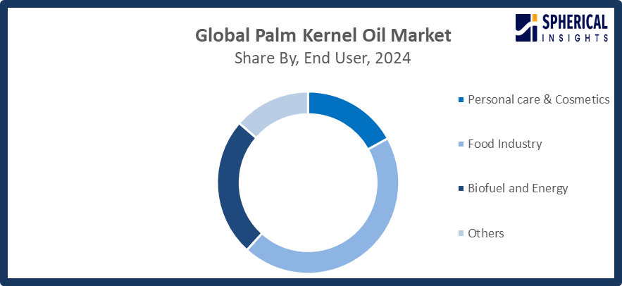 Based on the end user, the palm kernel oil market is divided into personal care & cosmetics, food industry, biofuel and energy, and others. Among these, the food industry segment accounted for the highest market revenue in 2024 and is anticipated to grow at a significant CAGR during the forecast period. The food industry is a result of PKO's extensive use in processed foods, baking products, confections, cooking oils, and snacks, where its stability, high saturated fat content, and extended shelf life are highly prized. The market is growing as a result of rising customer demand for ready-to-eat products, edible oils, and convenience meals.