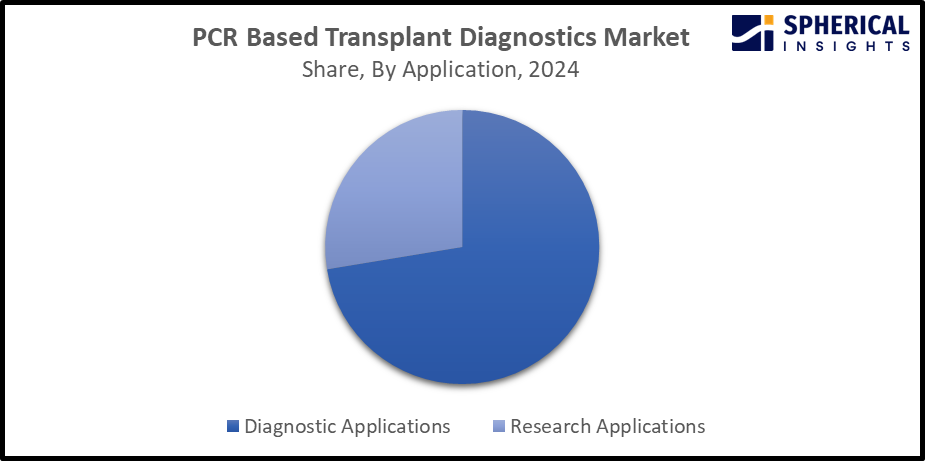 Based on the application, the PCR based transplant diagnostics market is divided into diagnostic applications and research applications. Among these, the diagnostic applications segment dominated the market with the largest share of 72.4% in 2024 and is projected to grow at a substantial CAGR during the forecast period. Due to the high sensitivity of PCR as molecular diagnostic techniques lead to the detection of earlier detection of viral replication in the post transplant period, before the onset of symptoms. The widespread application of PCR testing in routine transplant patient management and monitoring contributes to driving market expansion in the diagnostic applications segment.