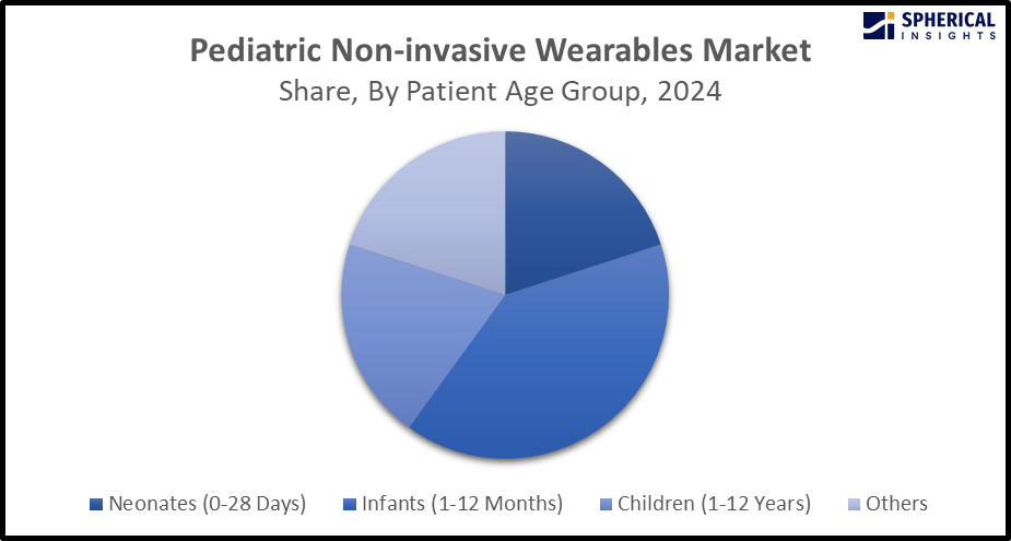 Based on the patient age group, the pediatric non-invasive wearables market is divided into neonates (0-28 days), infants (1-12 months), children (1-12 years), and others. Among these, the infants (1-12 years) segment accounted for the dominant market share of about 39.5% in 2024 and is anticipated to grow at a significant CAGR during the forecast period. Infants' health monitoring is important, which must be continuously monitored for detecting abnormalities, and the data must be saved on a cloud server and retrieved through a particular mobile app, allowing caregivers to track the baby's health remotely. In order to support age-specific requirements and thorough operational control procedures, healthcare facilities are optimizing equipment selections.
