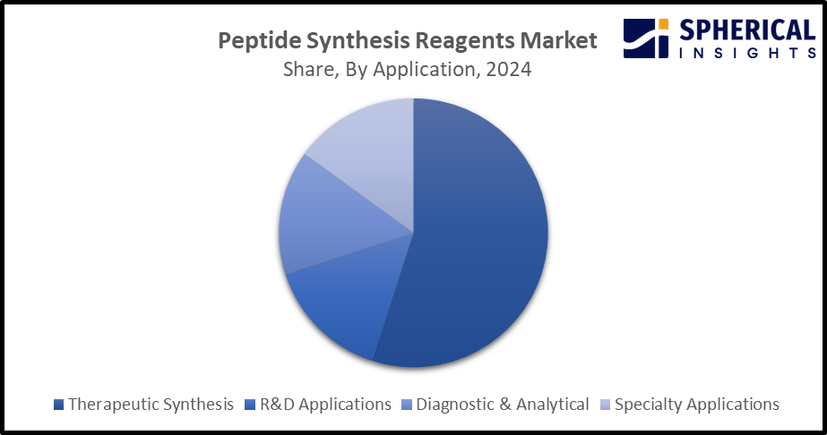 Based on the application, the peptide synthesis reagents market size is divided into therapeutic synthesis, R&D applications, diagnostic & analytical, and specialty applications. Among these, the therapeutic synthesis segment held a major market share of 60% in 2024 and is anticipated to grow at a significant CAGR of 7.2% during the projected period. Peptide synthesis is a backbone in the development of novel therapeutic agents and designing molecules targeting specific biological pathways and disease mechanisms. Further, the integration of advanced peptide chemistry, computational modelling, and HTP screening techniques for personalized medicine and precision therapeutics is bolstering the market growth in the therapeutic synthesis segment.