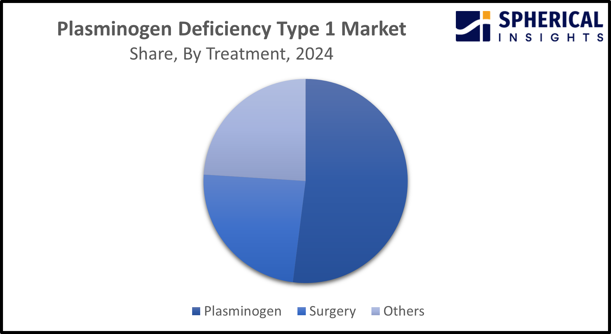 Based on the treatment, the Plasminogen Deficiency Type 1 Market Size is divided into plasminogen, surgery, and others. Among these, the plasminogen segment dominated the market with the largest share of about 52.0% in 2024 and is projected to grow at a substantial CAGR during the forecast period. Plasminogen-based therapy aids in increasing the plasminogen levels and resolving the fibrin-rich, ligneous lesions. The clinically proven ability of plasminogen for preventing thrombotic events, its targeted mechanism, and established efficacy are responsible for propelling the market.