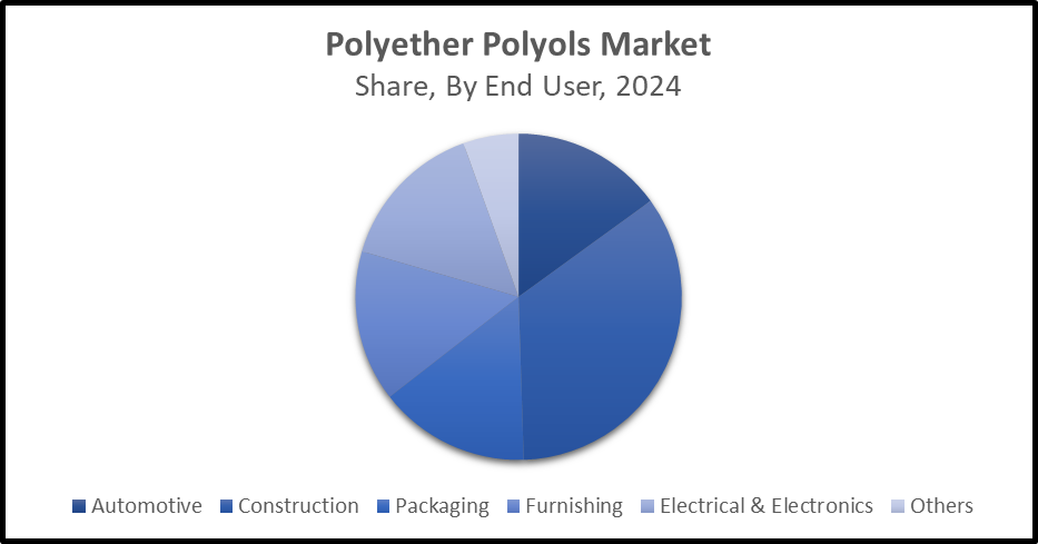 Based on the end user, the Polyether Polyols Market Size is divided into automotive, construction, packaging, furnishing, electrical & electronics, and others. Among these, the construction segment accounted for the largest share of around 34.5% share in 2024 and is anticipated to grow at a significant CAGR during the forecast period. In the construction sector, polyether polyols are used for producing high-performance polyurethane rigid foams, sealants, coatings, and adhesives. They enhance energy efficiency while providing structural durability primarily for thermal insulation in walls, roofs, and pipes. An increasing use of polyether polyols in the building and construction industry is propelling the market.