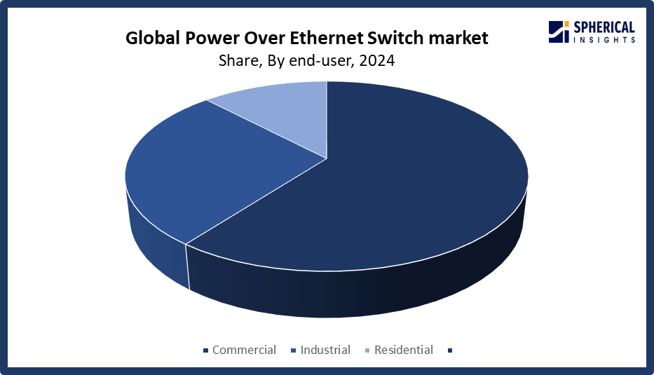 Based on the end-user, the power over ethernet switch market is divided into commercial, industrial, and residential. Among these, the commercial segment accounted for the largest share in 2024 and is anticipated to grow at a significant CAGR during the forecast period. The dominance is due to the widespread use of PoE switches in workplaces, retail establishments, healthcare facilities, and educational institutions. One major factor driving growth in these environments is the requirement for effective network solutions to handle VoIP phones, wireless access points, and IP cameras. Demand from the commercial sector is still high as companies continue to use smart and digital technology.