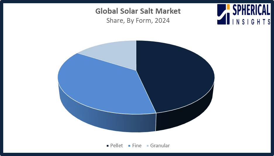Based on the form, the solar salt market is divided into pellet, fine, and granular. Among these, the pellet segment accounted for the largest share in 2024 and is anticipated to grow at a significant CAGR during the forecast period. The pellet segment is growing in the global solar salt market due to its uniform size, ease of handling, and efficient storage and transportation. Its growth comes from high demand for chemical processing, water treatment, and de-icing applications, where good pellet quality ensures consistent operations. Additionally, industrial preference for bulk, ready-to-use forms further supports the wide adoption of pelletized solar salt.