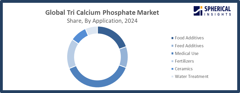 Based on the application, the tri calcium phosphate market is divided food additives, feed additives, medical use, fertilizers, ceramics, and water treatment. Among these, the medical use segment accounted for the highest market revenue in 2024 and is anticipated to grow at a significant CAGR during the forecast period. Tricalcium phosphate is mostly used as a calcium supplement in the medical field because of its non-toxic and biocompatible qualities. The medical use mostly uses tri-calcium phosphate since it is a calcium phosphate supplement that has no toxicity and is widely used owing to its biomedical qualities.