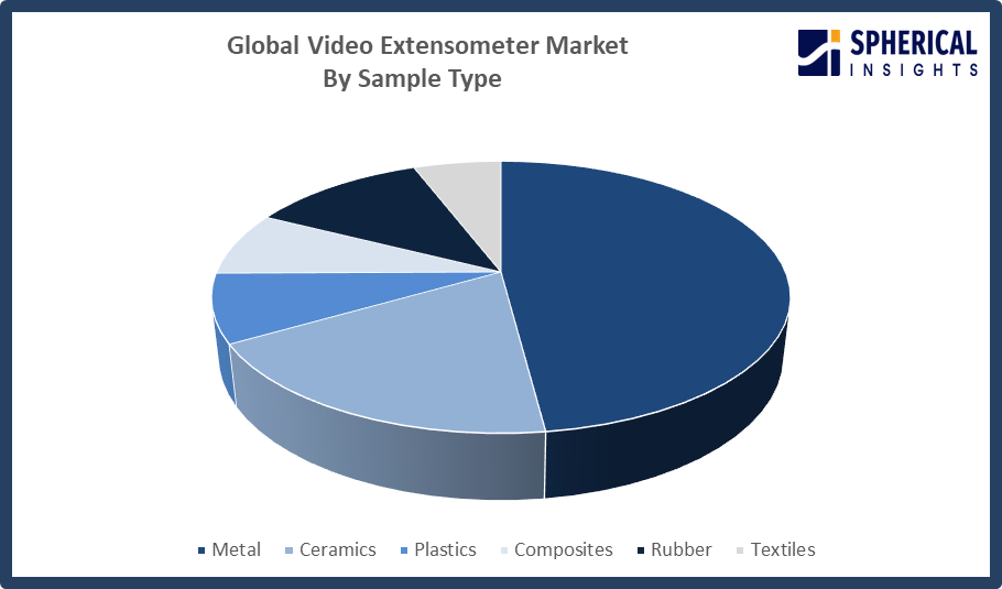 Based on the sample type, the video extensometer market is divided into metal, ceramics, plastics, composites, rubber, and textiles. Among these, the metal segment accounted for the largest share in 2024 and is anticipated to grow at a significant CAGR during the forecast period. The extensive utilization of metal parts in the manufacturing, automotive, aerospace, and construction industries where tensile, compressive, and fatigue properties testing is necessary is the main reason for this growth. They make it possible to do non-contact measurement, thus reducing sample deformation and providing high-accuracy results that can be repeated. This is the reason why video extensometers have been preferred in this segment.