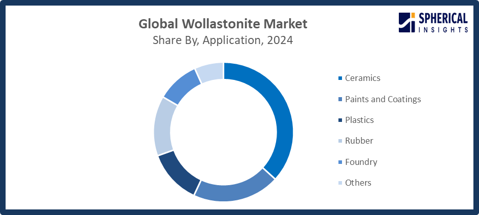 Based on the application, the wollastonite market is divided into ceramics, paints and coatings, plastics, rubber, foundry, and others. Among these, the ceramics segment accounted for the highest market revenue in 2024 and is anticipated to grow at a significant CAGR during the forecast period. Ceramics is motivated by its vital function in the production of pottery, sanitary ware, and tiles. Wollastonite's high aspect ratio, low thermal expansion, and capacity to improve surface quality and mechanical strength make it a popular choice in ceramic formulations.