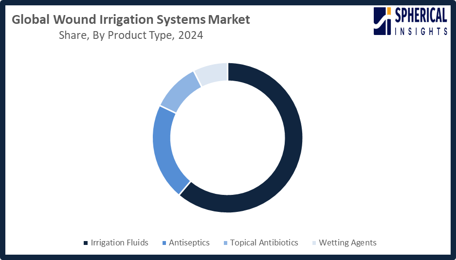 Based on the product type, the wound irrigation systems market is divided into irrigation fluids, antiseptics, topical antibiotics, and wetting agents. Among these, the irrigation fluids segment accounted for the largest share in 2024 and is anticipated to grow at a significant CAGR during the forecast period. These factors have contributed to segment growth, including an increasing use of saline and sterile solutions for the purpose of effective cleaning of wounds, rising surgical procedures, and growing prevalence of chronic wounds. Furthermore, their wide availability, safety, and compatibility with various wound types further drive demand for irrigation fluids globally.